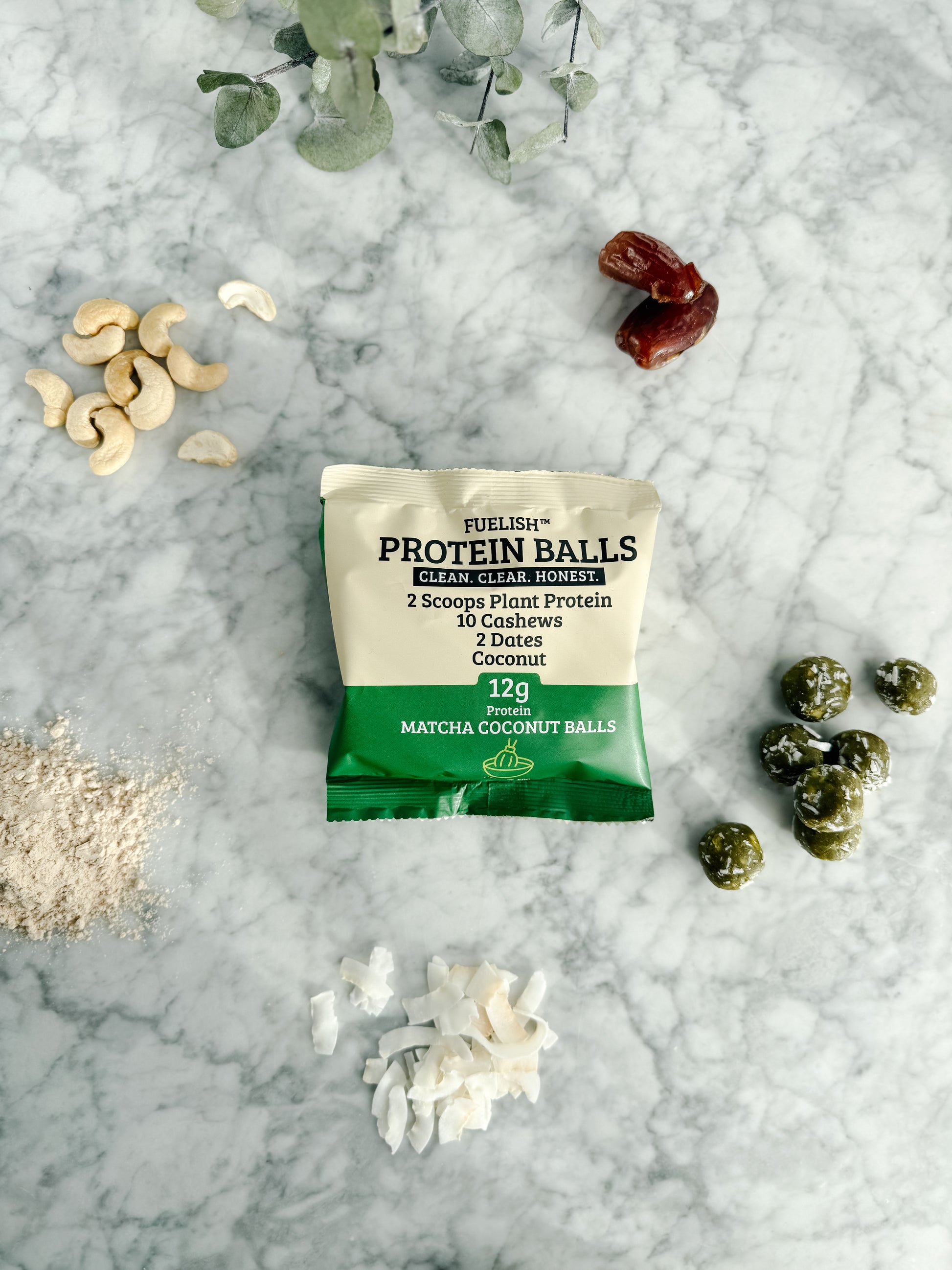 Ingredienser: Dadlar, cashewnötter, ärt-/risprotein, matcha, kokos.